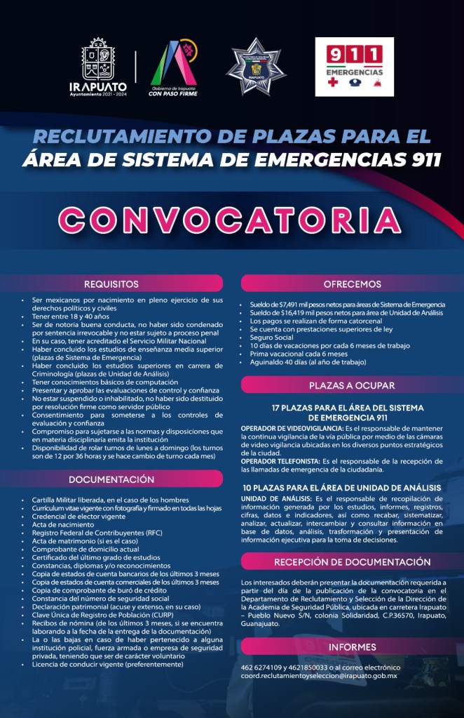 Para mayor información comunicarse al Centro de Atención Ciudadana 072, al teléfono 462 185 00 33, 462 62 7 41 09 o acudir a las instalaciones de la Academia de Seguridad Pública Municipal, ubicadas en la Carretera Irapuato- Pueblo Nuevo s/n., colonia Solidaridad.