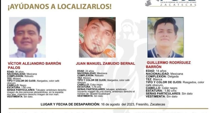 El miércoles pasado fueron reportados como desaparecidos 4 jóvenes en la ciudad de Fresnillo. A través de redes sociales, familiares y amigos alertaron a la comunidad de la ausencia de Guillermo Rodríguez Barrón, de 14 años; Víctor Alejandro Barrón Palos, de 36; Juan Manuel Zamudio Bermúdez, de 24 años y un último joven cuya identidad se desconoce hasta el momento.