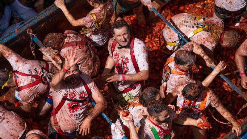 Cerca de 18 mil personas —2 mil más que en la anterior edición— tomaron este miércoles las calles del municipio de Buñol (Valencia, España) para teñirlas de rojo en su Tomatina «más internacional» desde la pandemia de covid-19. A las 12:00 en punto del miércoles comenzaron a caer los primeros tomates que daban inicio a la 76 edición de la tradicional fiesta que ha convertido las calles más céntricas del municipio en una batalla campal «sin igual».