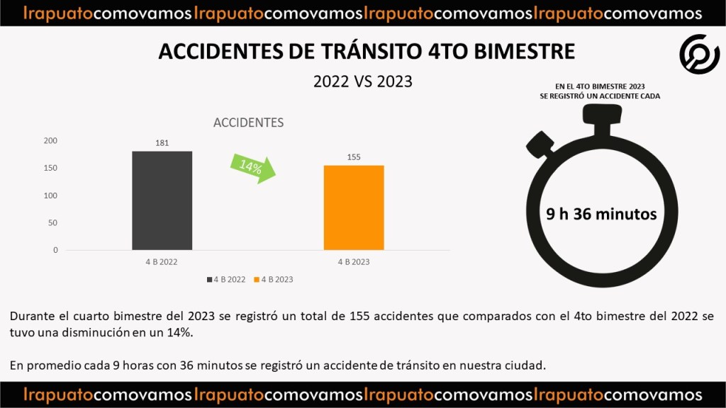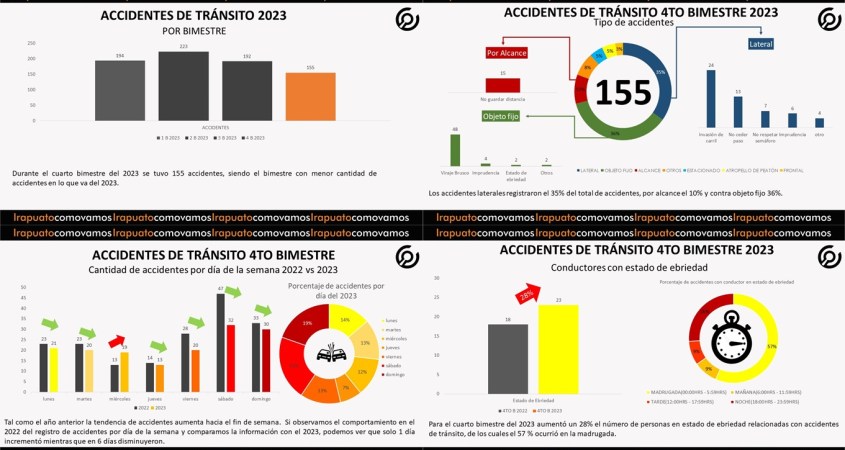 Durante el cuarto bimestre del 2023 se registró un total de 155 accidentes de tránsito en la zona urbana, esta información brindada por la Dirección de tránsito y movilidad del municipio de Irapuato a través de solicitudes de acceso a la información pública, lo cual significó una disminución del 14% en relación con el cuarto bimestre del 2022.