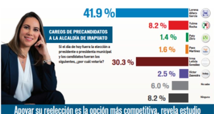 Así lo arrojó la más reciente encuesta de la agencia TAG Research, con base en la opinión de 500 irapuatenses entrevistados cara a cara en su domicilio entre el 16 y 19 de septiembre. El estudio reveló que en este momento Lorena Alfaro ganaría con 11.5 puntos de diferencia a Irma Leticia González, si es que se confirma que ella sería la candidata de Morena.
