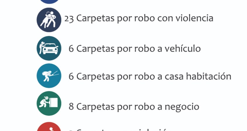 Se han registrado en promedio semana: 3 carpetas por homicidio doloso, 3 por culposo, 1 carpeta por extorsión, 23 por robo con violencia, 6 por robo a vehículo, 6 por robo a casa habitación, 8 por robo a negocio, 3 por violación, 43 carpetas por violencia familiar, 8 por narcomenudeo y 31 por lesiones dolosas.