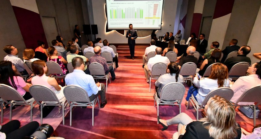 Rosario Gutiérrez Sandoval, directora de Proximidad Ciudadana, explicó a las y los asistentes que se apoya a las empresas con capacitaciones en temas de prevención de la violencia y la delincuencia, uso y recomendaciones del botón de enlace ciudadano y campañas preventivas para prevenir delitos como extorsiones y robos.
