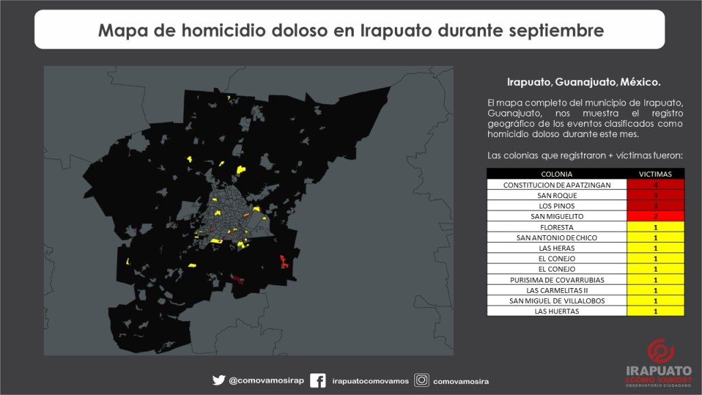 El reporte mensual de víctimas por homicidio doloso del Observatorio ciudadano Irapuato ¿cómo vamos? presenta la información condensada del registro de víctimas y eventos acontecidos en el municipio de Irapuato, Guanajuato.