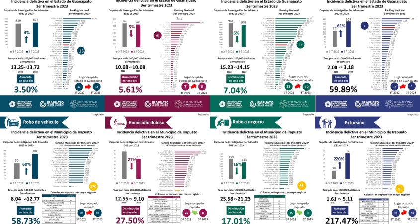 El observatorio ciudadano Irapuato ¿cómo vamos? presenta su reporte de incidencia delictiva del estado de Guanajuato y del municipio de Irapuato correspondiente al tercer trimestre del 2023 destacando los siguientes datos: