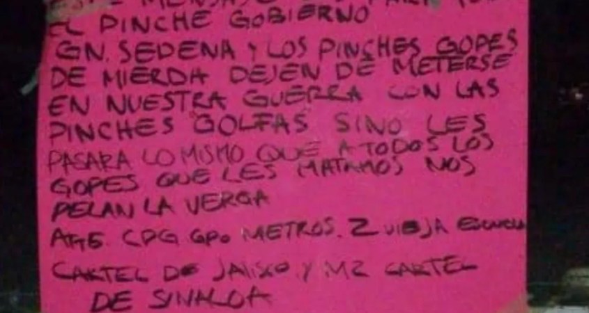“Este mensaje es para todo el p*nche gobierno, GN [Guardia Nacional], Sedena y los p*nches GOPES (Grupo de Operaciones Especiales) de mi*rda. Dejen de meterse en nuestra guerra con las p*nches Golfas si no les pasará lo mismo que a los GOPES que les matamos. Atte: CDG Grupo Metro, ZVE, Cártel Jalisco y MZ Cártel de Sinaloa”, es el texto que podía leerse en varios puntos de las demarcaciones mencionadas.