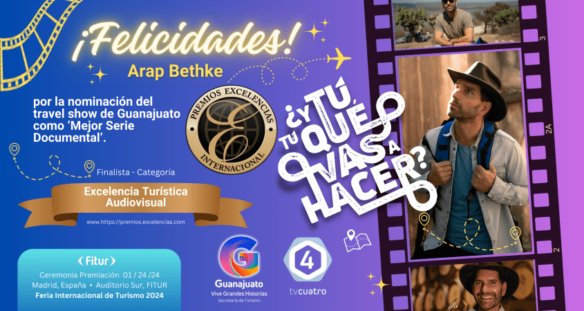 ¿Y Tú, Tú Qué Vas a Hacer?, el «Travel show» del actor Arap Bethke sobre el hermoso estado de Guanajuato, ha sido nominado como mejor serie documental en los de los Premios Excelencias, categoría ‘Excelencia Turística Audiovisual’.