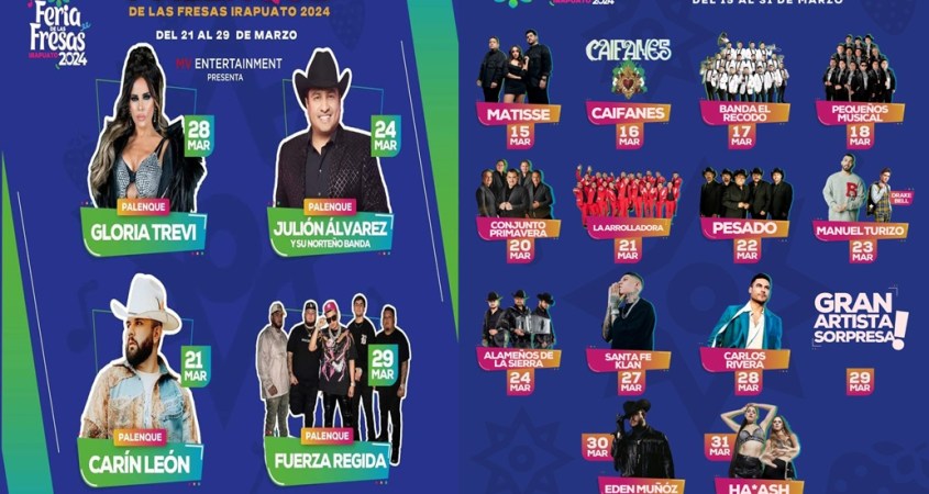 En el Palenque, habitantes y visitantes de Irapuato podrán disfrutar de grandes artistas como Carín León, Julión Álvarez y su Norteño Banda, Gloria Trevi y Fuerza Regida.
