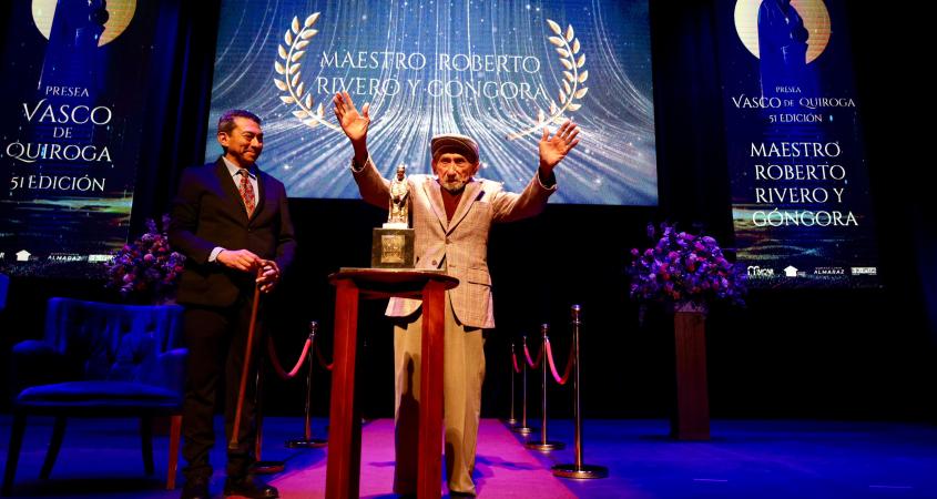 Autoridades municipales hicieron entrega de la presea Vasco de Quiroga al maestro Roberto Rivero y Góngora, mejor conocido como ‘Riverito’, como parte del Festival de la Ciudad para conmemorar los 477 años de la Fundación de Irapuato.