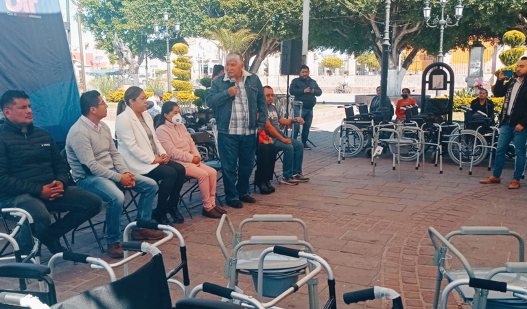 Se hizo la entrega de aparatos de movilidad con 58 sillas de ruedas todo terreno, seis sillas con baño, 29 andaderas, tres muletas, dos sillas PCI, cinco sillas PCA, bastones, etcétera.