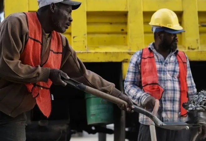 En una calle de la capital, cinco haitianos taladran el pavimento para instalar tuberías cerca de un cine abandonado. Jony, el único que habla español, es el enlace entre los patrones y el resto de trabajadores, quienes hablan criollo haitiano y sonríen a cualquiera que los mire.