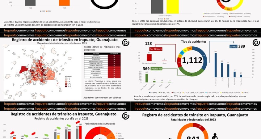 Durante 2023 se registró un total de 1,112 accidentes de tránsito en la zona urbana, esta información brindada por la Dirección de tránsito y movilidad del municipio de Irapuato a través de solicitudes de acceso a la información pública, lo cual significó una disminución del 2.8% en relación con 2022.