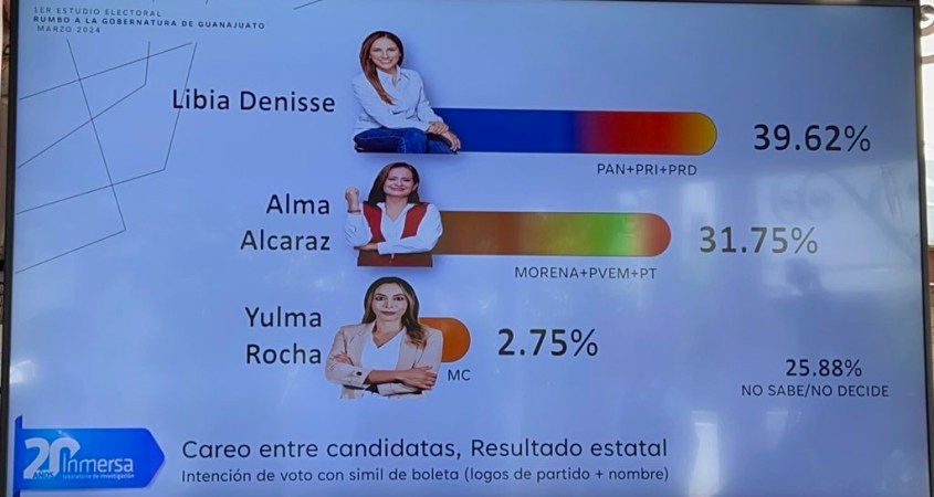 En rueda de prensa, el director de Inmersa, Rodolfo Nuñez, compartió que Libia Denisse arranca con el 39.62 por ciento de las preferencias; Alma Alcaraz con el 31.75 y Yulma Rocha con el 2.75 por ciento, mientras que el 25.8 por ciento de los encuestados aún no decide por quién votará.