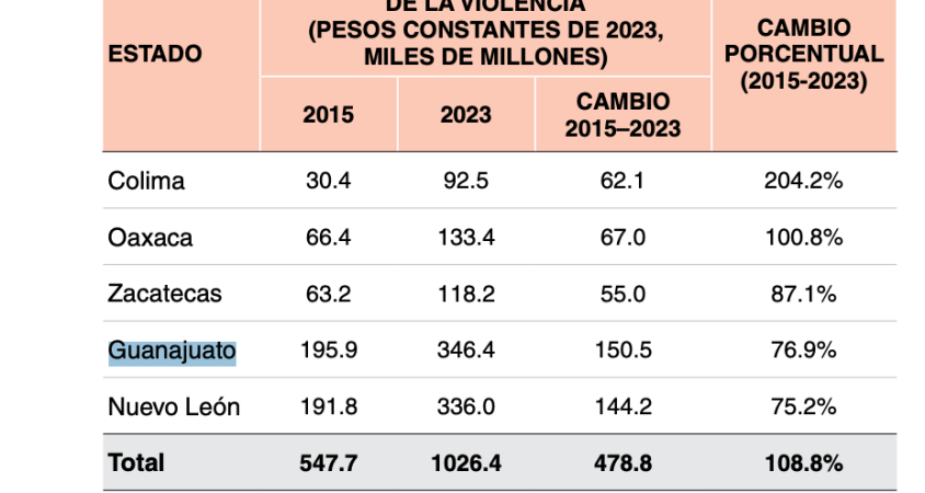 En el 2023, el impacto económico de la violencia en Guanajuato fue de 346 mil millones de pesos, la segunda cifra más alta a nivel nacional, solo por debajo de Estado de México, donde se estimó en 620 mil millones de pesos.