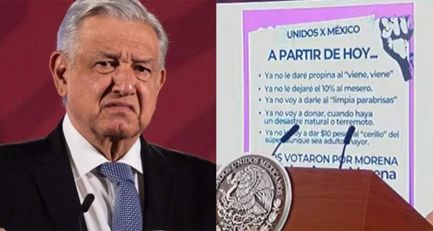 “A partir de hoy ya no le dará propina al ‘viene viene’, ya no le daré 10% al mesero, ya no le daré al ‘limpiaparabrisas’, ya no voy a donar cuando haya n desastre natural o terremoto, ya no le voy a dar $10 pesos al ‘cerillo’ del super, aunque sea adulto mayor. Ellos votaron por Morena #QueLesAyudeMorena”, dice la imagen.