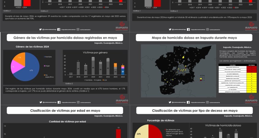 El reporte mensual de víctimas por homicidio doloso del Observatorio ciudadano Irapuato ¿cómo vamos? presenta la información condensada del registro de víctimas y eventos acontecidos en el municipio de Irapuato, Guanajuato.