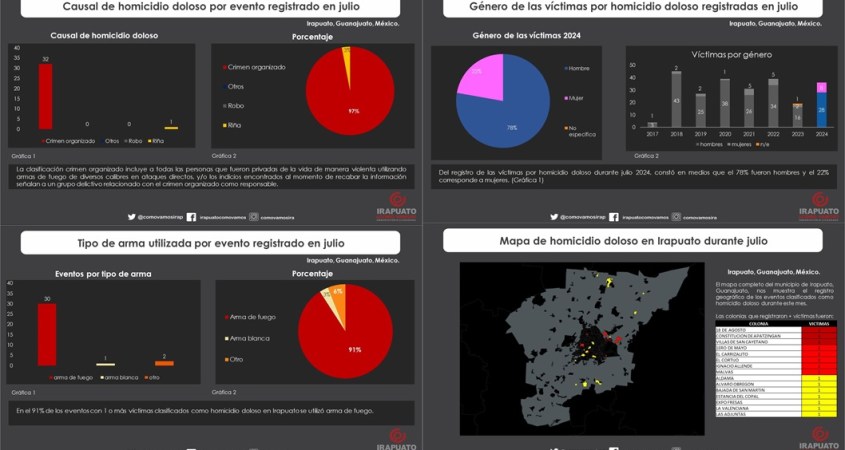 El reporte mensual de víctimas por homicidio doloso del Observatorio Ciudadano Irapuato ¿cómo vamos? presenta la información condensada del registro de víctimas y eventos acontecidos en el municipio de Irapuato, Guanajuato.