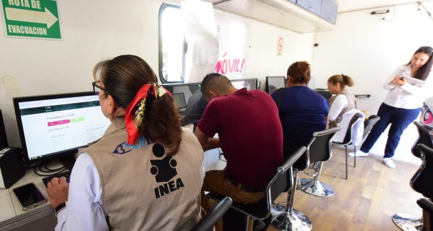 El Instituto de Alfabetización y Educación Básica para Adultos (INAEBA) también participa en esta actividad con su unidad móvil, en la que aplicaron el examen único y, de acuerdo con el nivel que alcance el solicitante, podría obtener su certificado de estudios básicos.