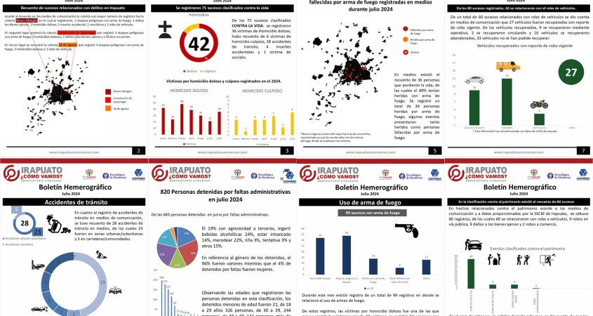Durante el mes de julio del 2024 se registró en medios de comunicación que 42 personas perdieron la vida clasificada en homicidio, 36 clasificadas en doloso y 6 en culposo.