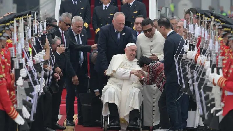 El pontífice, que dedicará este martes al descanso, desembarcó de la aeronave en silla de ruedas y fue recibido por una guardia de honor, altos cargos indonesios y dos niños con un ramo de flores. Después del recibimiento, Jorge Mario Bergoglio subió a un modesto sedán Toyota blanco que lo trasladó a la Nunciatura Apostólica de la Santa Sede en Yakarta donde se encontró con huérfanos, migrantes y personas sin hogar, según el Vaticano.