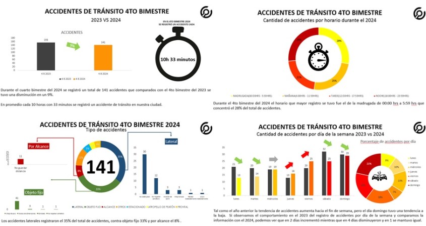 - En el cuarto bimestre del 2024, en 2 días de la semana aumentó el número de accidentes respecto al mismo periodo, pero del 2023.