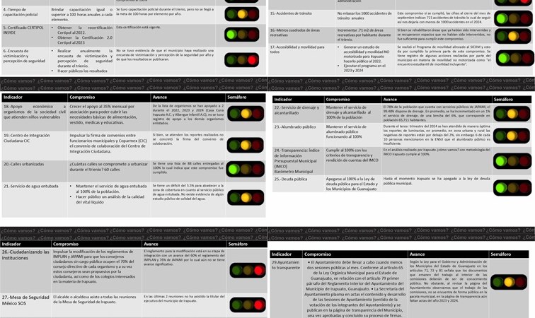 • Comentarios: Irapuato cumplió con el 98.1% de estos compromisos, dejando pendientes en cubrir las plazas de policías preventivos vacantes entre otros indicadores. (Semáforo amarillo)