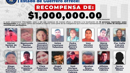 La Fiscalía General del Estado (FGE) de Guerrero ha anunciado una recompensa de hasta un millón de pesos para quienes proporcionen información veraz y útil que facilite la localización de 16 personas desaparecidas en las inmediaciones de El Epazote, municipio de Chilpancingo.