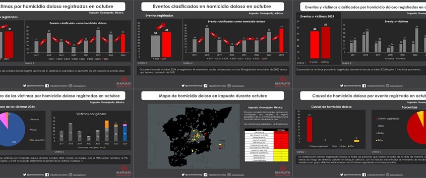 El reporte mensual de víctimas por homicidio doloso del Observatorio Ciudadano Irapuato ¿cómo vamos? presenta la información condensada del registro de víctimas y eventos acontecidos en el municipio de Irapuato, Guanajuato.