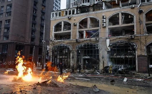 Las fotos del lugar mostraban el techo destrozado de un bloque de oficinas con las ventanas rotas en el centro de Kiev y a los bomberos extinguiendo un incendio después de que un automóvil sufriera graves daños en la calle de abajo.