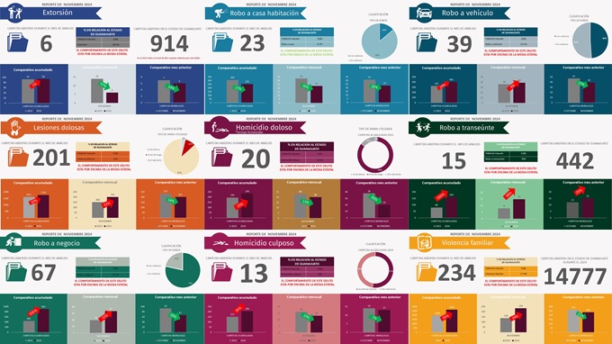 Durante el mes de noviembre 2024 se registró un total de 145 carpetas por este delito que comparadas con el mes de noviembre 2023 registró aumento en cifras de un 33%. En el comparativo acumulado considerando las cifras del 2024 vs el mismo periodo, pero del 2023 podemos observar un aumento del 57%.