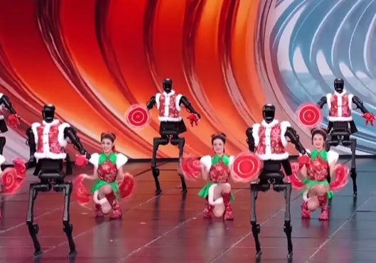 Uno de los momentos más llamativos ocurrió cuando 16 robots humanoides, vestidos con chaquetas rojas festivas, subieron al escenario para bailar junto a varias artistas femeninas humanas.