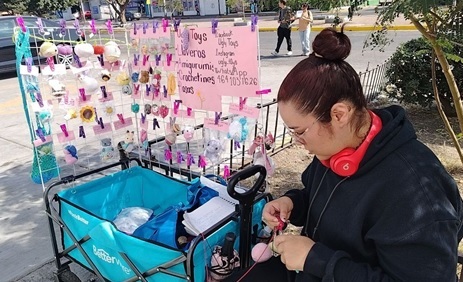 Por las tardes, afuera de la Unidad Uno de la Escuela de Nivel Medio Superior de Salamanca, Dalila ofrece sus creaciones, en su mayoría llaveros con diversas figuras, mientras teje otras artesanías.