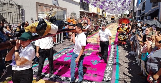 Para la conmemoración del 465 aniversario de su llegada, la imagen recorrió por primera vez un tramo más amplio de la zona centro de la ciudad, para iniciar y concluir pasando por encima del tapete monumental que elaboraron los integrantes del colectivo La Catrina.
