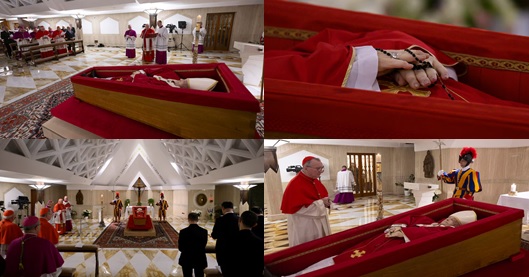Francisco yace dentro de un féretro de madera forrado en terciopelo rojo, dispuesto en la capilla privada de la residencia, donde permaneció rodeado de sus colaboradores más cercanos y numerosos cardenales presentes en Roma.