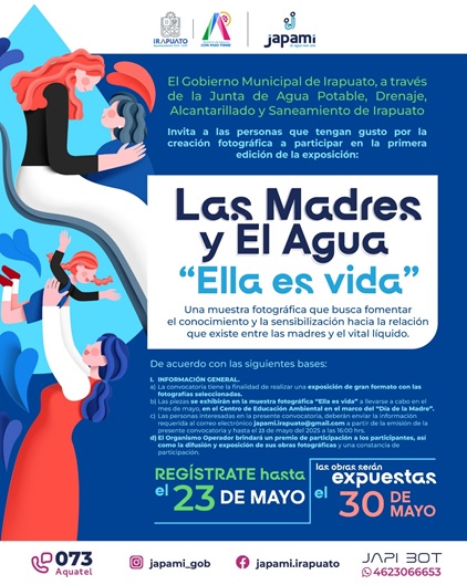 Para fomentar la sensibilización hacia la relación existente entre las madres y el cuidado del agua, la Junta de Agua Potable, Drenaje, Alcantarillado y Saneamiento de Irapuato (Japami) invita al concurso de fotografía “Las madres y el agua, ella es vida”.