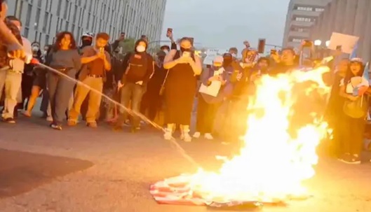 Acto seguido, varias personas avanzaron para rociar la bandera con líquido inflamable, intensificando el fuego. Otros participantes escupieron sobre el símbolo nacional mientras gritaban frases como “¡Quémenla!” y “¡Hazlo grande como el 92!”, en aparente referencia a los disturbios de 1992 tras el caso Rodney King, la última vez que la Guardia Nacional fue desplegada en la ciudad.