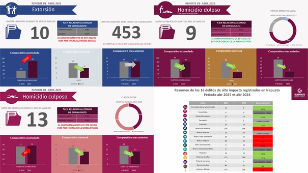 Durante el mes de abril 2025 se registró un total de 168 carpetas por este delito que comparadas con el mes de abril 2024 registró aumento en cifras de un 20%. En el comparativo acumulado considerando las cifras del 2025 vs el mismo periodo, pero del 2024 podemos observar un aumento del 8%.