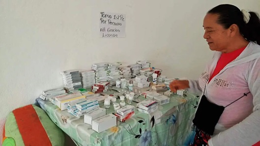 En el área donde la gente entra formada y sale con su dotación de leche Liconsa, 30 pesos por 4 litros, hay una mesa de madera en donde la gente deja o toma el medicamento que necesita, y que por lo general es aquel que no requiere receta.