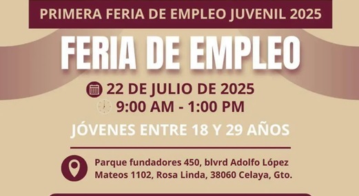 El próximo martes 22 de julio se llevará a cabo la “Primera Feria de Empleo Juvenil” en Celaya, con un horario de 9:00 a.m. a 1:00 p.m., en las instalaciones del Parque Fundadores del municipio. El evento está dirigido principalmente a jóvenes de 18 a 29 años de edad.
