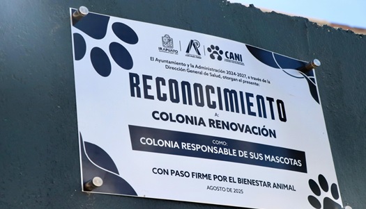 La colonia Renovación fue certificada como “Colonia Responsable de sus Mascotas”, programa que impulsa el Gobierno de Irapuato, a través de la Dirección de Salud Municipal, con el objetivo de fomentar la tenencia responsable de perros y gatos, así como fortalecer el vínculo entre la salud animal y la salud pública.