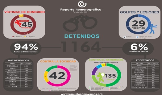 Acorde a los datos de la Secretaría de Seguridad Ciudadana de Irapuato se tuvo un registro de 1164 personas detenidas por faltas administrativas y/o presuntos delitos.