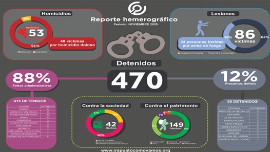 Acorde a los datos de la Secretaría de Seguridad Ciudadana de Irapuato y nuestro registro hemerográfico, se tuvo un registro de 470 personas detenidas por faltas administrativas y/o presuntos delitos, incluyendo personas detenidas en operativos y cateos por la FGE.