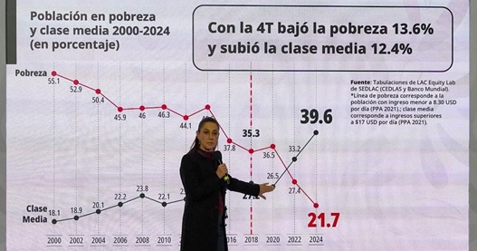 Durante su conferencia matutina, la mandataria presentó cifras del Banco Mundial para mostrar la evolución social del país en las últimas décadas. Recordó que al inicio del siglo XXI, tras varios sexenios de políticas neoliberales, la pobreza alcanzaba más de la mitad de la población, mientras que la clase media apenas representaba el 18.1 por ciento.