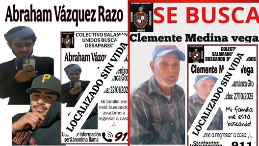 Colectivo Salmantinos Unidos Buscando Desaparecidos confirmó que esta semana se localizaron los cuerpos de Abraham Vázquez, quien habría sido sustraído de su casa en la comunidad de Los Cenizos el pasado 22 de enero y del adulto Mayor Clemente Medina Vega, desaparecido el 27 de octubre del año pasado.