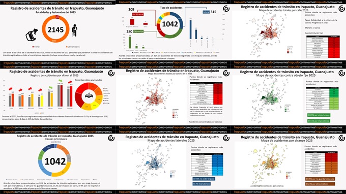Durante 2025 se registró un total de 1042 accidentes de tránsito en Irapuato. Esta información brindada por la Dirección de tránsito y movilidad del municipio de Irapuato a través de solicitudes de acceso a la información pública, así como el registro diario de accidentes de tránsito en medios digitales e impresos por parte del Observatorio Ciudadano.