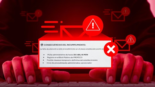 Estos mensajes falsos presentados como si provinieran del organismo advierten a los proveedores sobre supuestas multas, registros en el Buró Público o incluso posibles clausuras, con amenazas que buscan generar urgencia y confusión, e incluso solicitan a los destinatarios realizar pagos para “evitar el cierre del negocio”, pese a que no existe procedimiento formal alguno para tales acciones.