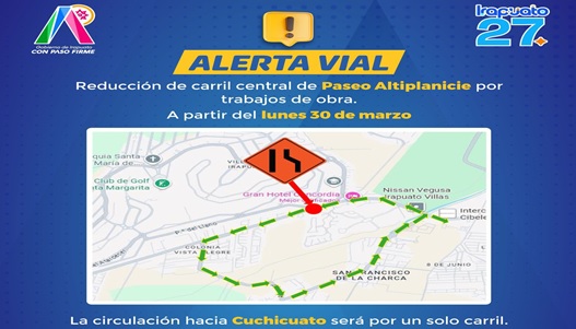 A partir del lunes 6 de abril, la circulación vehicular se realizará por el carril ya concluido de la calle Paseo Altiplanicie, en el tramo que va de Paseo del Verano hacia la salida a Cuchicuato. De manera simultánea, se cerrará el carril sur para permitir el desarrollo de las labores durante la Semana de Pascua, del 6 al 11 de abril.