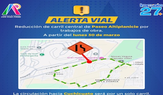 A partir del lunes 6 de abril, la circulación vehicular se realizará por el carril ya concluido de la calle Paseo Altiplanicie, en el tramo que va de Paseo del Verano hacia la salida a Cuchicuato. De manera simultánea, se cerrará el carril sur para permitir el desarrollo de las labores durante la Semana de Pascua, del 6 al 11 de abril.